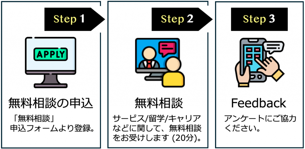 サービス/留学/キャリアに関して一般的な相談を誰かにしたいが、気軽にできないということがあります。まずは無料相談フォームに登録してみてください。