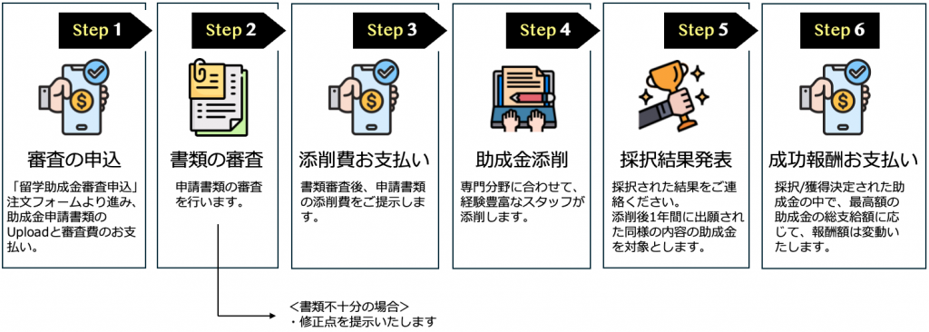 - 添削費を受領した日から1年以内に獲得された助成金は成功報酬をお支払いください。詳細はStep 6を参照ください。