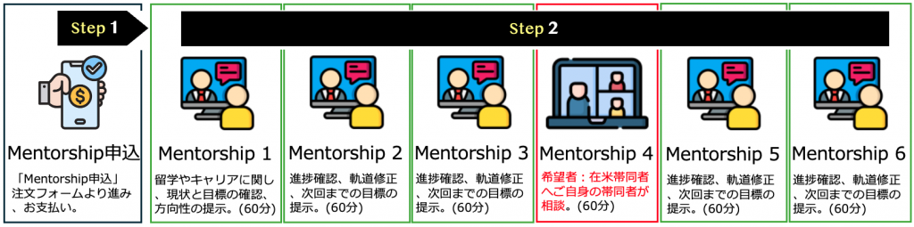 将来の留学、もしくはキャリア構築のため、個々人の目的・状況・性格に合わせてMentoringします。留学希望もしくは予定時期に向けて、毎月もしくは2ヶ月毎にミーティングをします(60分、6回コース)。